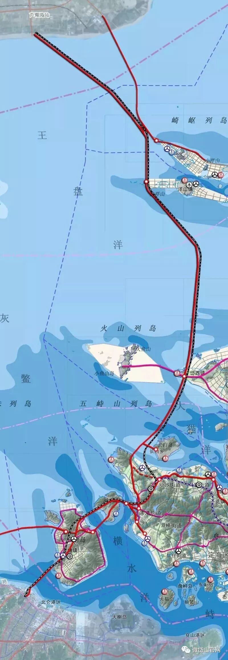 铁路通道起于甬舟铁路马岙站,向北先后跨越长白西航道、舟山中部港域西航道、岱山南航道、岱山北航道、西航路习惯航路、金山航道、漕泾东航道,止于大洋山岛西侧,接上海市规划的东海二桥。