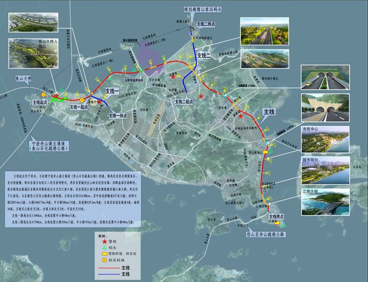 公路通道起于岱山双合,顺接在建的宁波舟山港主通道,向北先后跨越岱山北航道、西航路习惯航路、金山航道、漕泾东航道,止于大洋山岛西侧,接上海市规划的东海二桥,并设置大小洋山连接线接东海大桥。